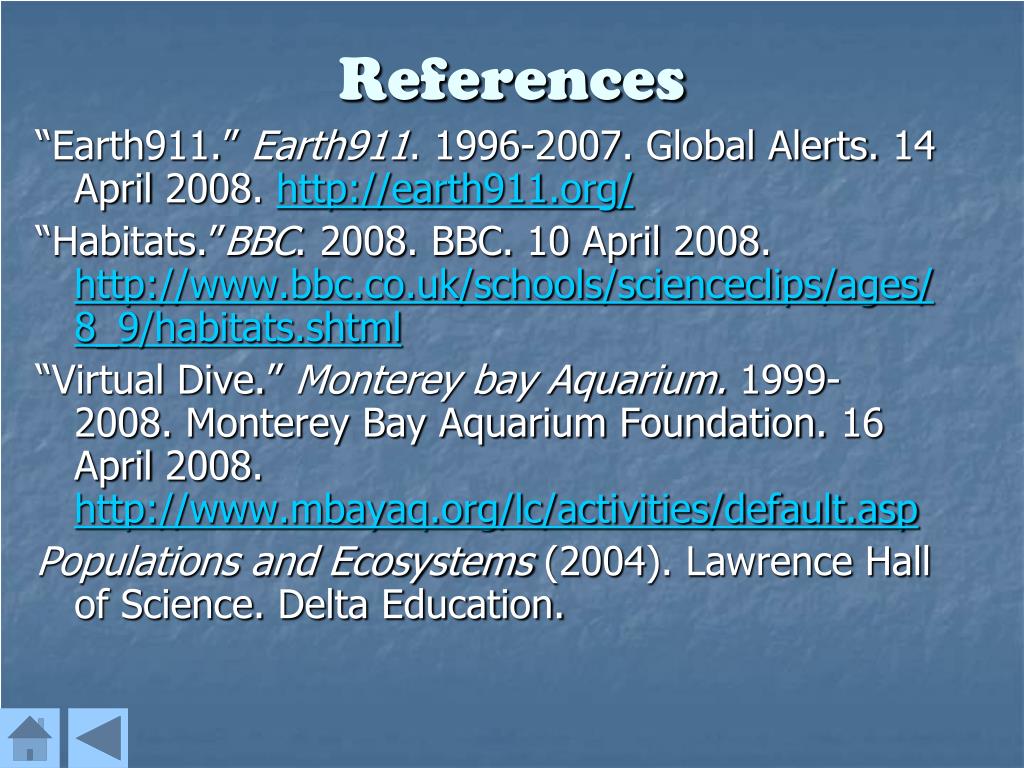 References “Earth911.” Earth911. 1996-2007. Global Alerts. 14 April 2008. http://earth911.org/ “Habitats.”BBC. 2008. BBC. 10 April 2008. http://www.bbc.co.uk/schools/scienceclips/ages/8_9/habitats.shtml “Virtual Dive.” Monterey bay Aquarium. 1999-2008. Monterey Bay Aquarium Foundation. 16 April 2008. http://www.mbayaq.org/lc/activities/default.asp Populations and Ecosystems (2004). Lawrence Hall of Science. Delta Education.