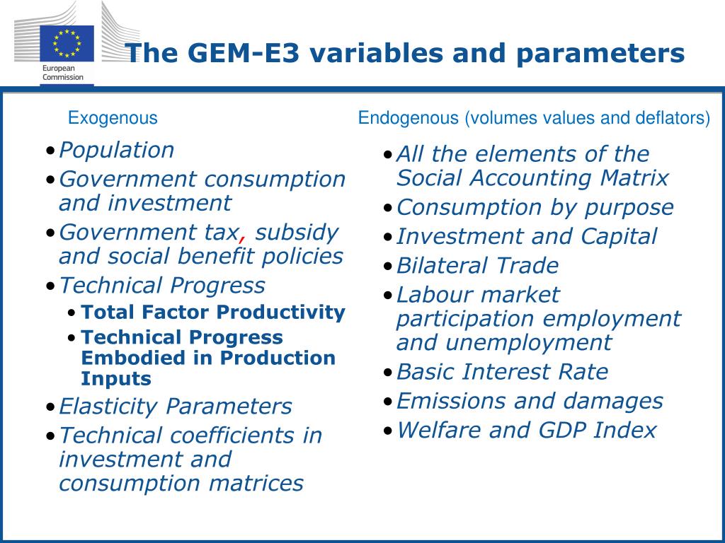 The GEM-E3 variables and parameters Exogenous Endogenous (volumes values and deflators) • Population • Government consumption and investment • Government tax, subsidy and social benefit policies • Technical Progress • Total Factor Productivity • Technical Progress Embodied in Production Inputs • Elasticity Parameters • Technical coefficients in investment and consumption matrices • All the elements of the Social Accounting Matrix • Consumption by purpose • Investment and Capital • Bilateral Trade • Labour market participation employment and unemployment • Basic Interest Rate • Emissions and damages • Welfare and GDP Index