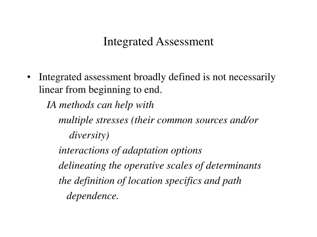 Integrated Assessment • Integrated assessment broadly defined is not necessarily linear from beginning to end. IA methods can help with multiple stresses (their common sources and/or diversity) interactions of adaptation options delineating the operative scales of determinants the definition of location specifics and path dependence.
