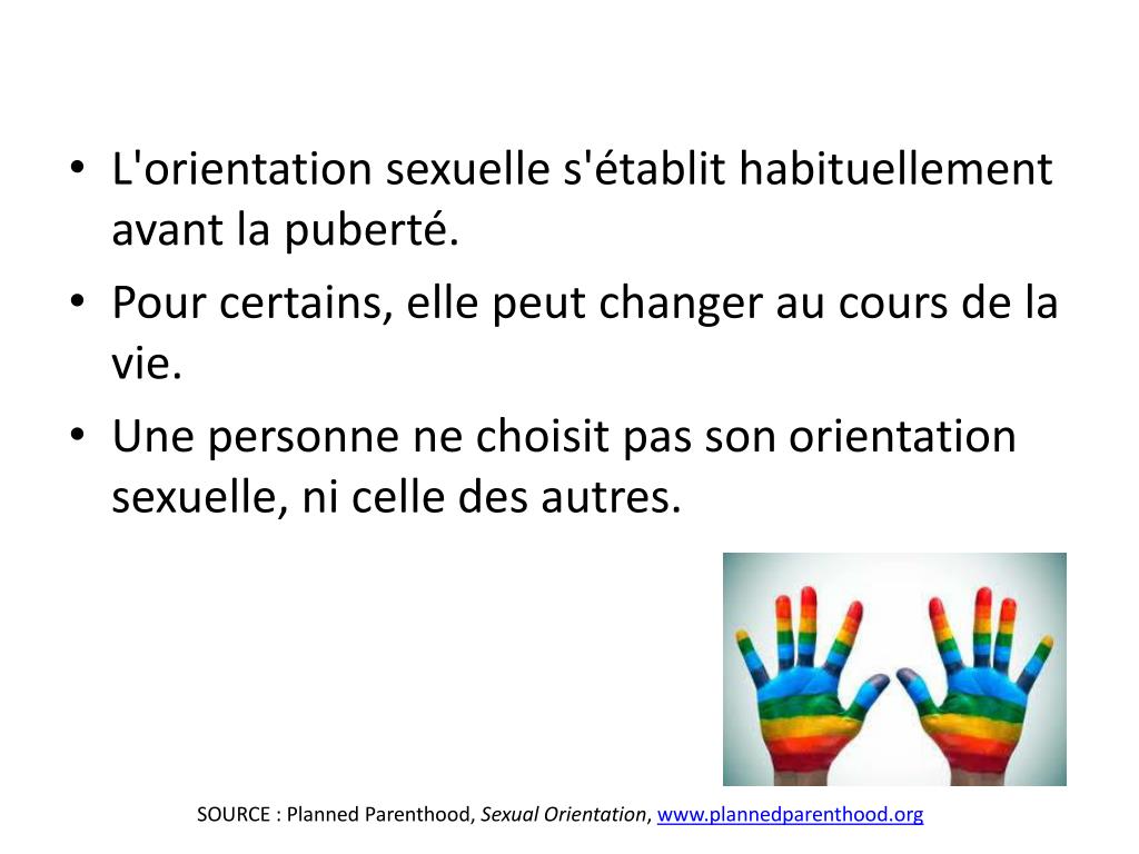 L'orientation sexuelle s'établit habituellement avant la puberté. • Pour certains, elle peut changer au cours de la vie. • Une personne ne choisit pas son orientation sexuelle, ni celle des autres. SOURCE : PlannedParenthood, Sexual Orientation, www.plannedparenthood.org