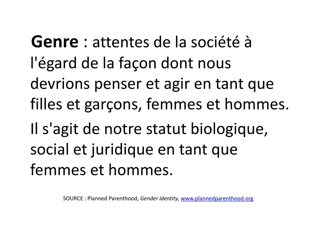 Genre : attentes de la société à l'égard de la façon dont nous devrions penser et agir en tant que filles et garçons, femmes et hommes. Il s'agit de notre statut biologique, social et juridique en tant que femmes et hommes. SOURCE : PlannedParenthood, GenderIdentity, www.plannedparenthood.org