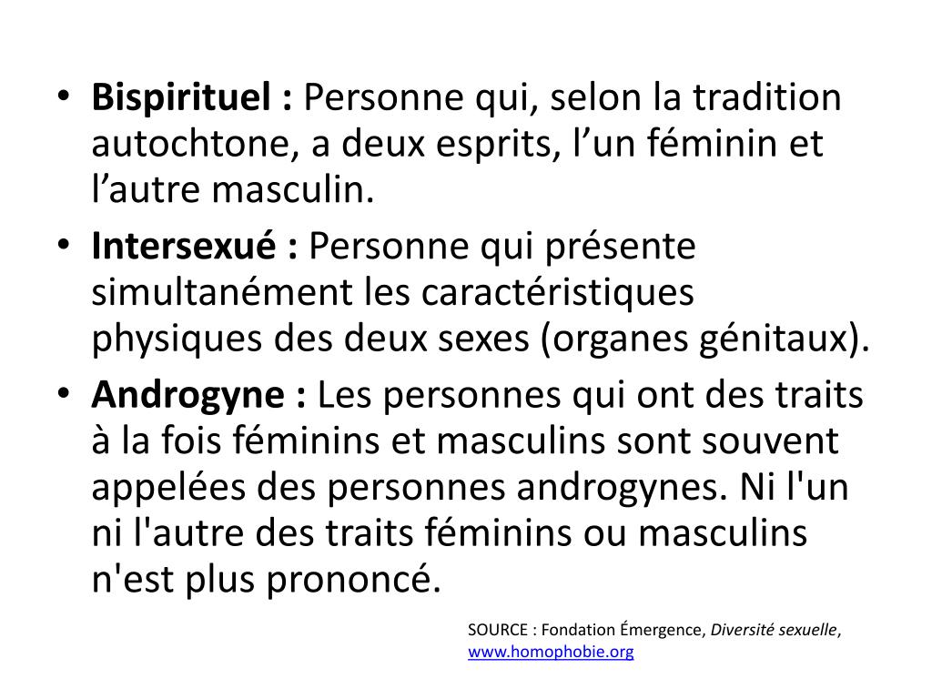 Bispirituel : Personne qui, selon la tradition autochtone, a deux esprits, l’un féminin et l’autre masculin. • Intersexué : Personne qui présente simultanément les caractéristiques physiques des deux sexes (organes génitaux). • Androgyne : Les personnes qui ont des traits à la fois féminins et masculins sont souvent appelées des personnes androgynes. Ni l'un ni l'autre des traits féminins ou masculins n'est plus prononcé. SOURCE : Fondation Émergence, Diversité sexuelle, www.homophobie.org