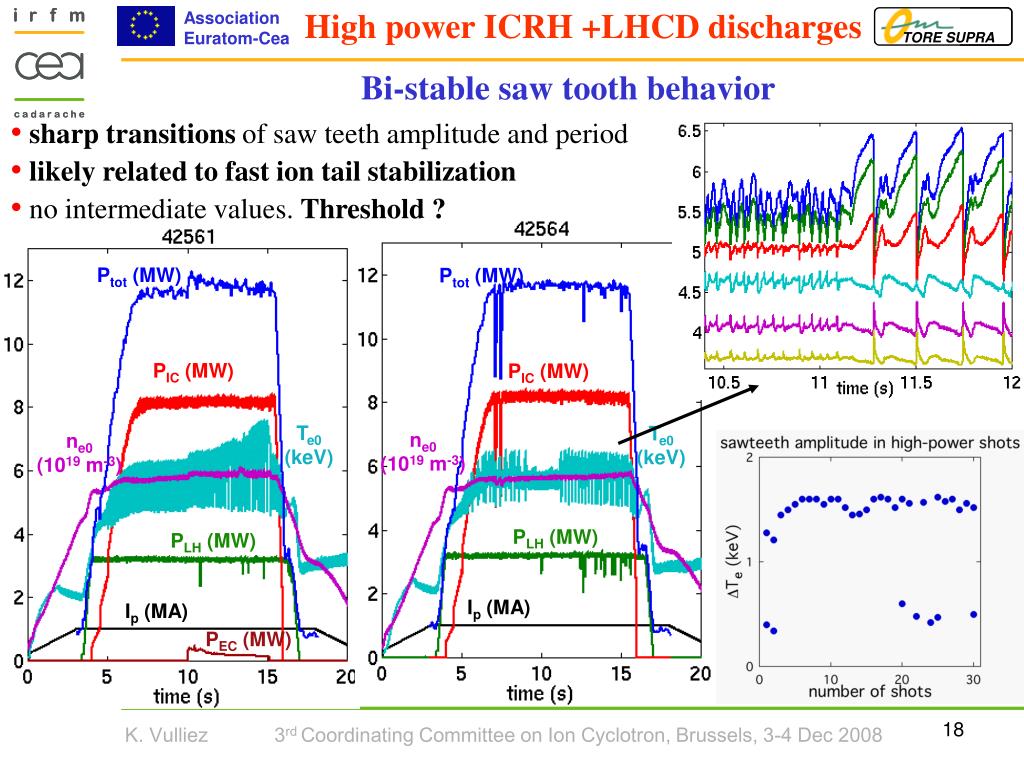 High power ICRH +LHCD discharges • sharp transitions of saw teeth amplitude and period • likely related to fast ion tail stabilization • no intermediate values. Threshold ? Ptot (MW) Ptot (MW) PIC (MW) PIC (MW) Te0 (keV) Te0 (keV) ne0 (1019 m-3) ne0 (1019 m-3) PLH (MW) PLH (MW) Ip (MA) Ip (MA) PEC (MW) Bi-stable saw tooth behavior