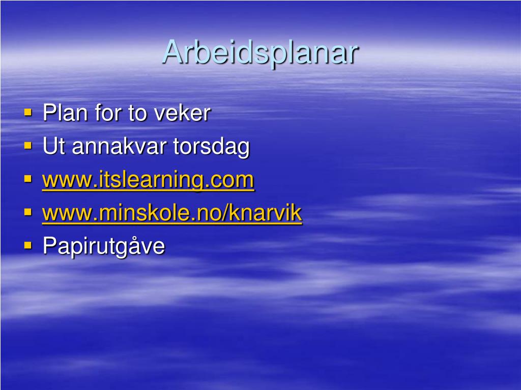 Arbeidsplanar • Plan for to veker • Ut annakvar torsdag • www.itslearning.com • www.minskole.no/knarvik • Papirutgåve