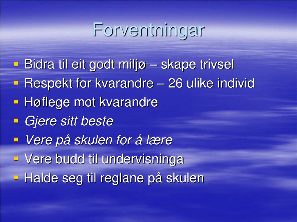 Forventningar • Bidra til eit godt miljø – skape trivsel • Respekt for kvarandre – 26 ulike individ • Høflege mot kvarandre • Gjere sitt beste • Vere på skulen for å lære • Vere budd til undervisninga • Halde seg til reglane på skulen