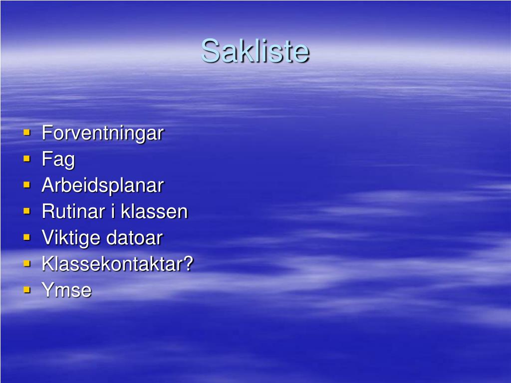 Sakliste • Forventningar • Fag • Arbeidsplanar • Rutinar i klassen • Viktige datoar • Klassekontaktar? • Ymse