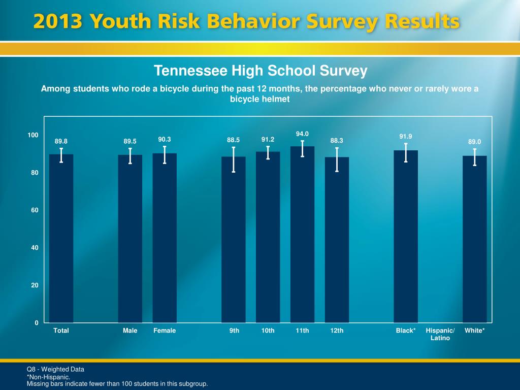Tennessee High School Survey Among students who rode a bicycle during the past 12 months, the percentage who never or rarely wore a bicycle helmet Q8 - Weighted Data *Non-Hispanic. Missing bars indicate fewer than 100 students in this subgroup.