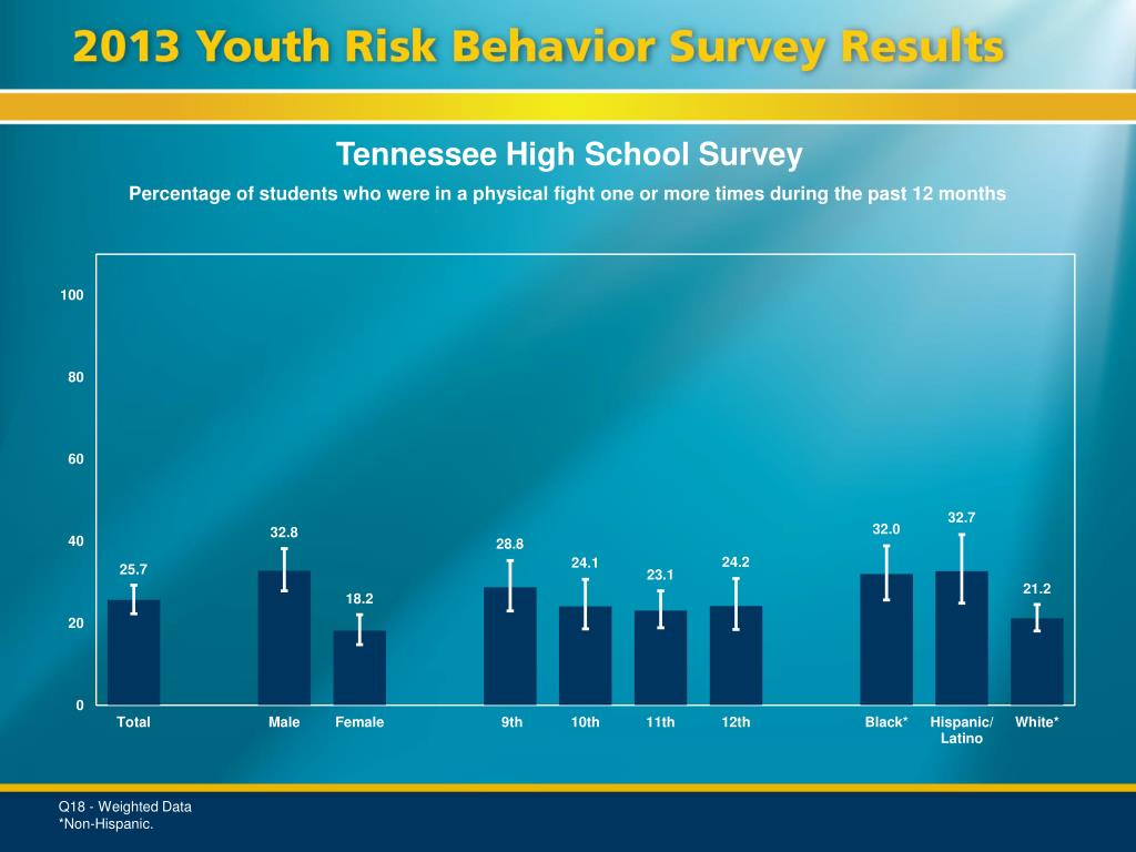 Tennessee High School Survey Percentage of students who were in a physical fight one or more times during the past 12 months Q18 - Weighted Data *Non-Hispanic.
