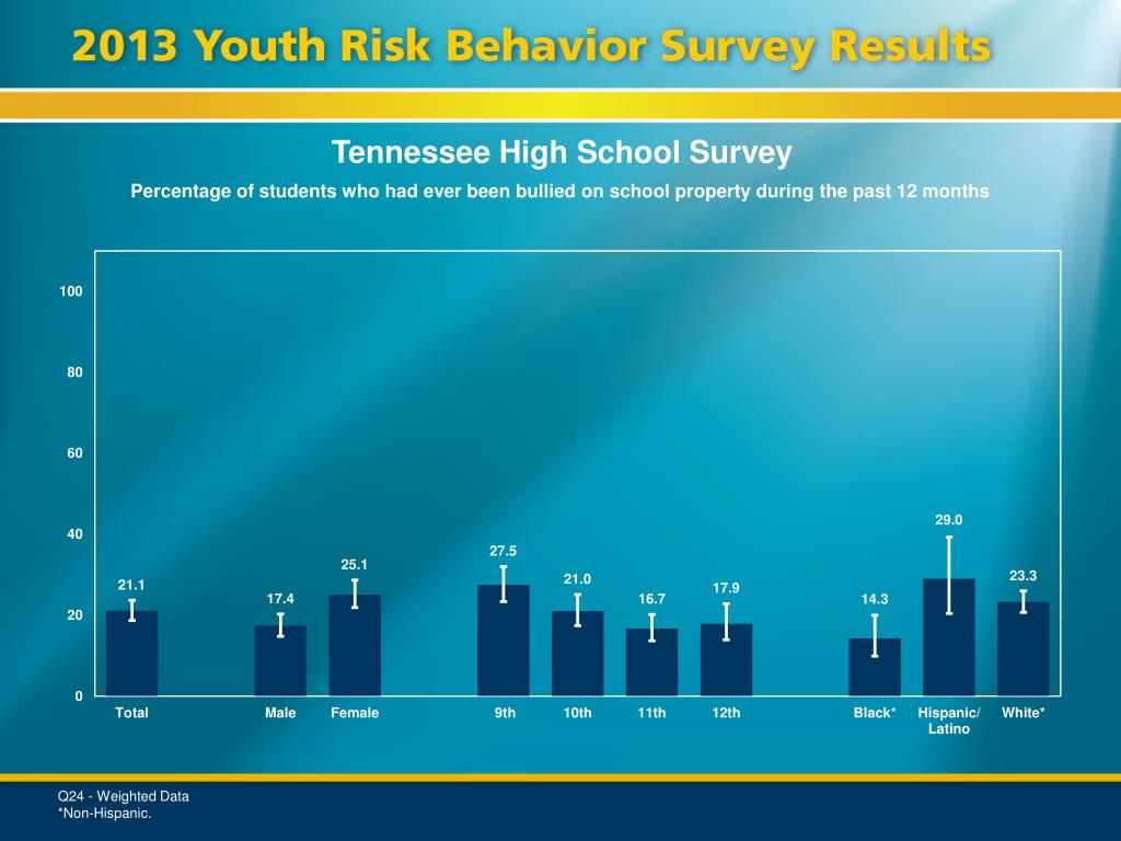 Tennessee High School Survey Percentage of students who had ever been bullied on school property during the past 12 months Q24 - Weighted Data *Non-Hispanic.