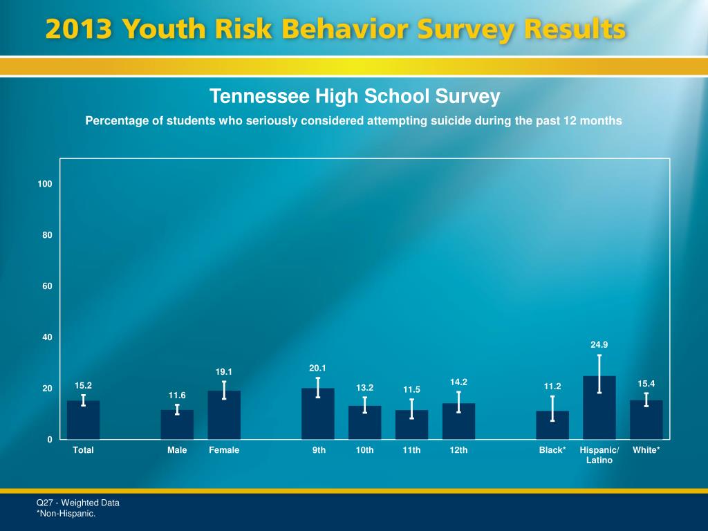 Tennessee High School Survey Percentage of students who seriously considered attempting suicide during the past 12 months Q27 - Weighted Data *Non-Hispanic.
