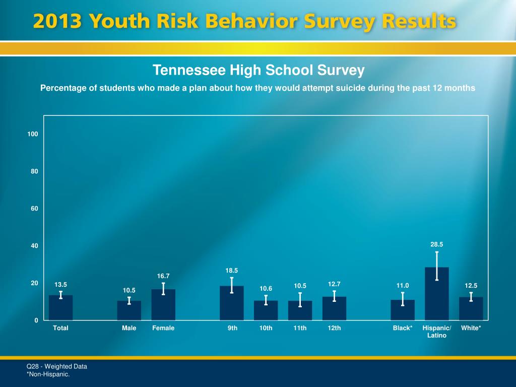 Tennessee High School Survey Percentage of students who made a plan about how they would attempt suicide during the past 12 months Q28 - Weighted Data *Non-Hispanic.
