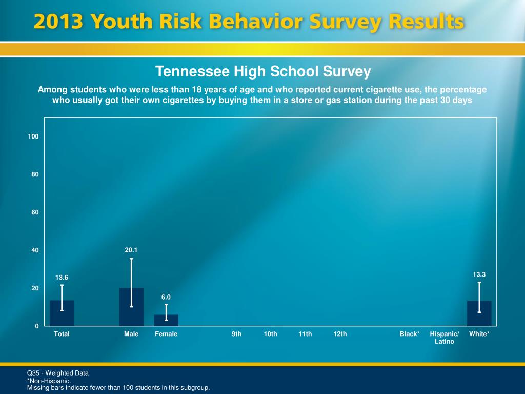 Tennessee High School Survey Among students who were less than 18 years of age and who reported current cigarette use, the percentage who usually got their own cigarettes by buying them in a store or gas station during the past 30 days Q35 - Weighted Data *Non-Hispanic. Missing bars indicate fewer than 100 students in this subgroup.
