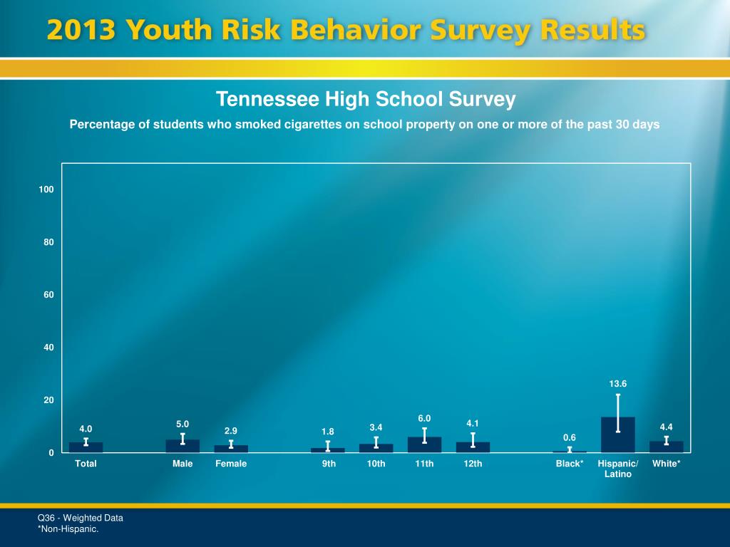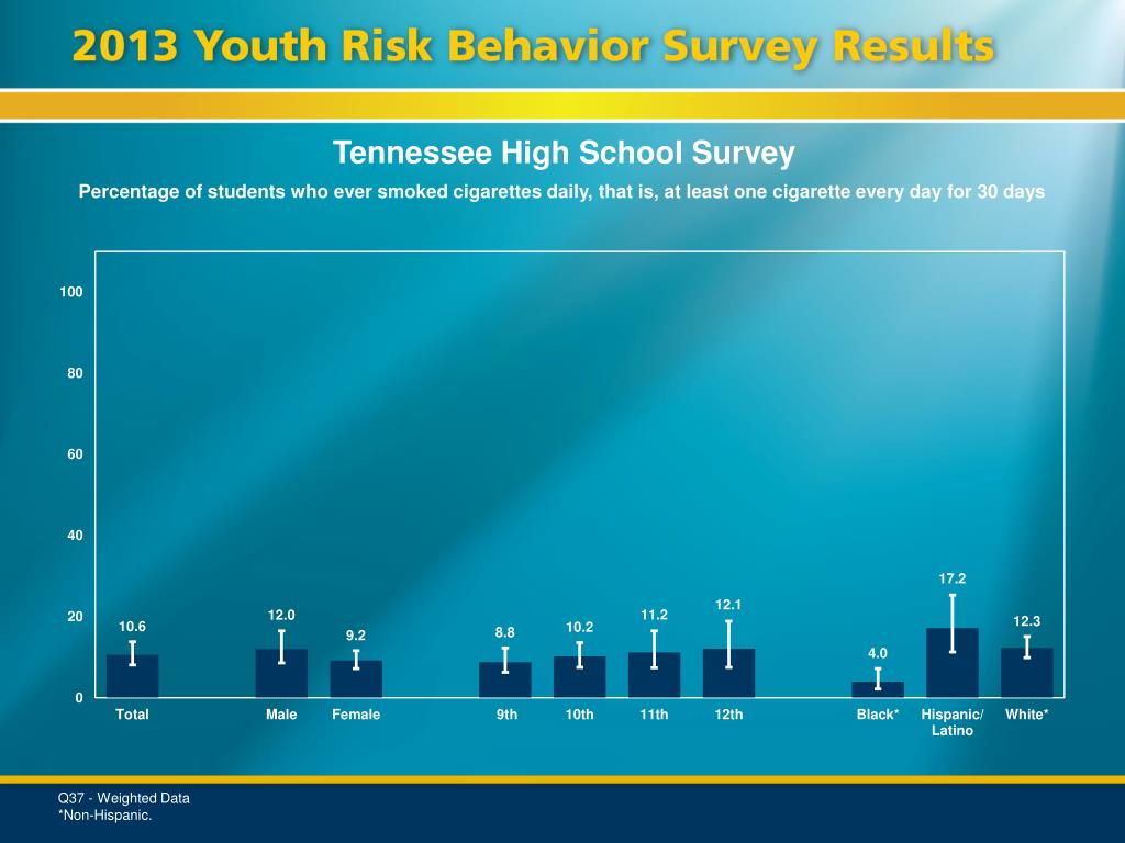 Tennessee High School Survey Percentage of students who ever smoked cigarettes daily, that is, at least one cigarette every day for 30 days Q37 - Weighted Data *Non-Hispanic.
