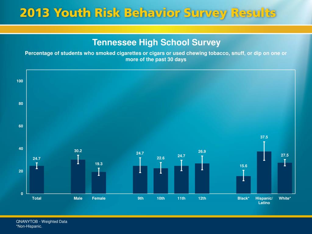 Tennessee High School Survey Percentage of students who smoked cigarettes or cigars or used chewing tobacco, snuff, or dip on one or more of the past 30 days QNANYTOB - Weighted Data *Non-Hispanic.