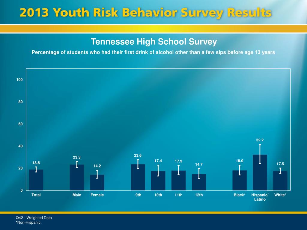Tennessee High School Survey Percentage of students who had their first drink of alcohol other than a few sips before age 13 years Q42 - Weighted Data *Non-Hispanic.