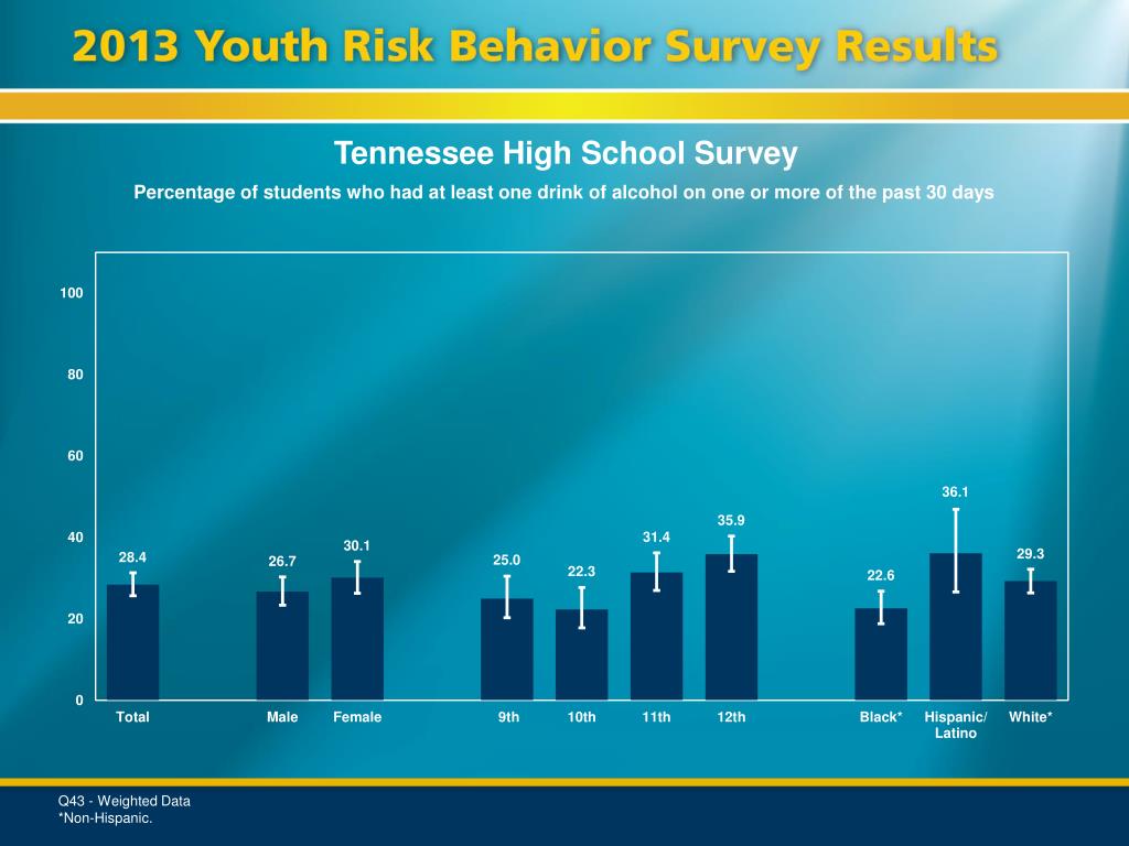 Tennessee High School Survey Percentage of students who had at least one drink of alcohol on one or more of the past 30 days Q43 - Weighted Data *Non-Hispanic.