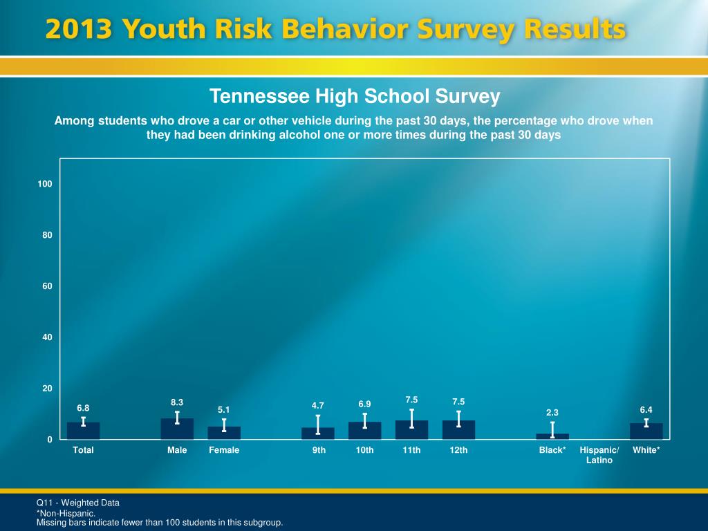 Tennessee High School Survey Among students who drove a car or other vehicle during the past 30 days, the percentage who drove when they had been drinking alcohol one or more times during the past 30 days Q11 - Weighted Data *Non-Hispanic. Missing bars indicate fewer than 100 students in this subgroup.