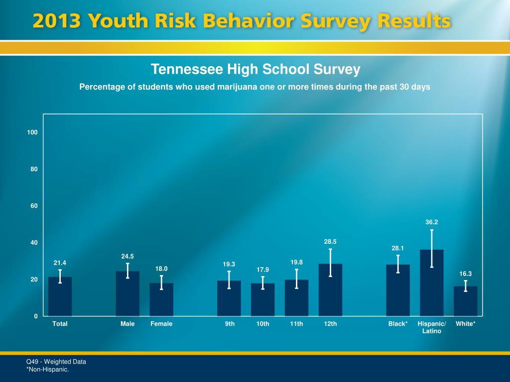 Tennessee High School Survey Percentage of students who used marijuana one or more times during the past 30 days Q49 - Weighted Data *Non-Hispanic.