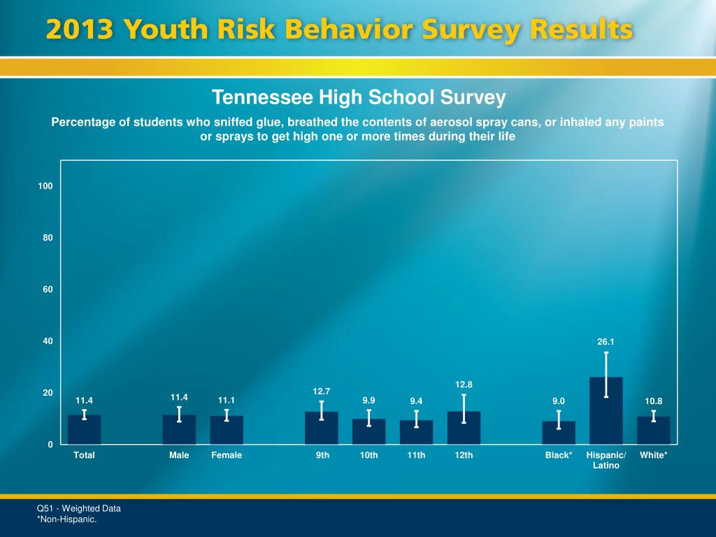 Tennessee High School Survey Percentage of students who sniffed glue, breathed the contents of aerosol spray cans, or inhaled any paints or sprays to get high one or more times during their life Q51 - Weighted Data *Non-Hispanic.