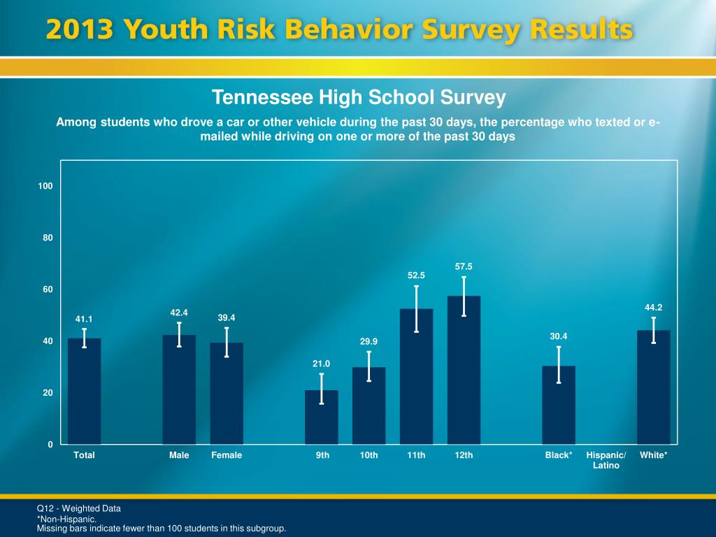 Tennessee High School Survey Among students who drove a car or other vehicle during the past 30 days, the percentage who texted or e-mailed while driving on one or more of the past 30 days Q12 - Weighted Data *Non-Hispanic. Missing bars indicate fewer than 100 students in this subgroup.