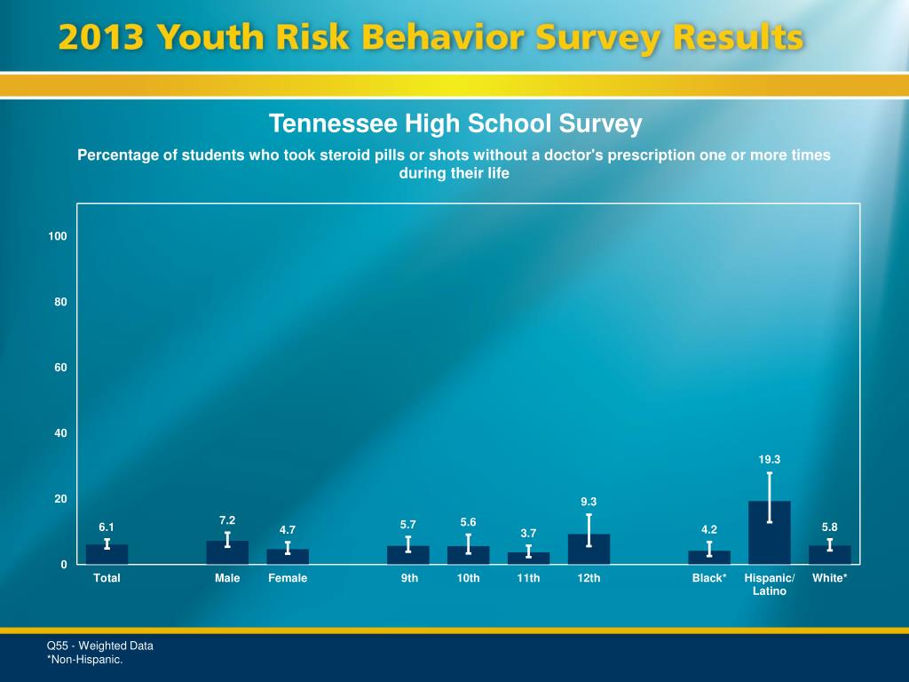 Tennessee High School Survey Percentage of students who took steroid pills or shots without a doctor's prescription one or more times during their life Q55 - Weighted Data *Non-Hispanic.