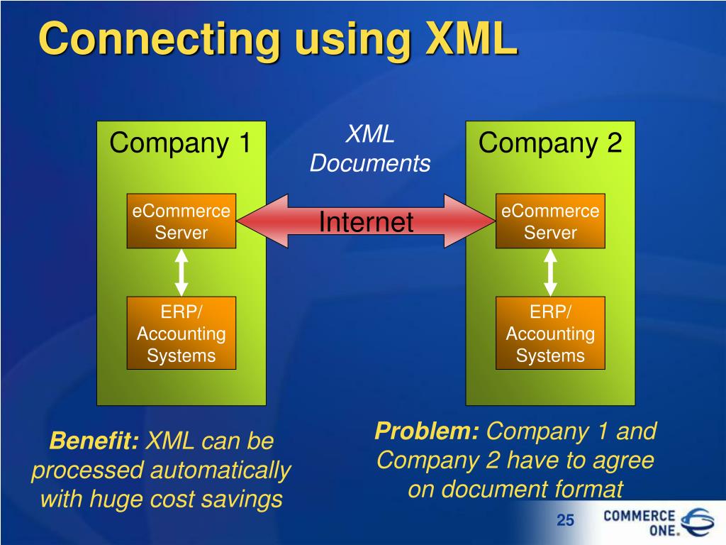Connecting using XML XML Documents Company 1 Company 2 eCommerceServer Internet eCommerceServer ERP/AccountingSystems ERP/AccountingSystems Problem: Company 1 and Company 2 have to agree on document format Benefit: XML can be processed automatically with huge cost savings