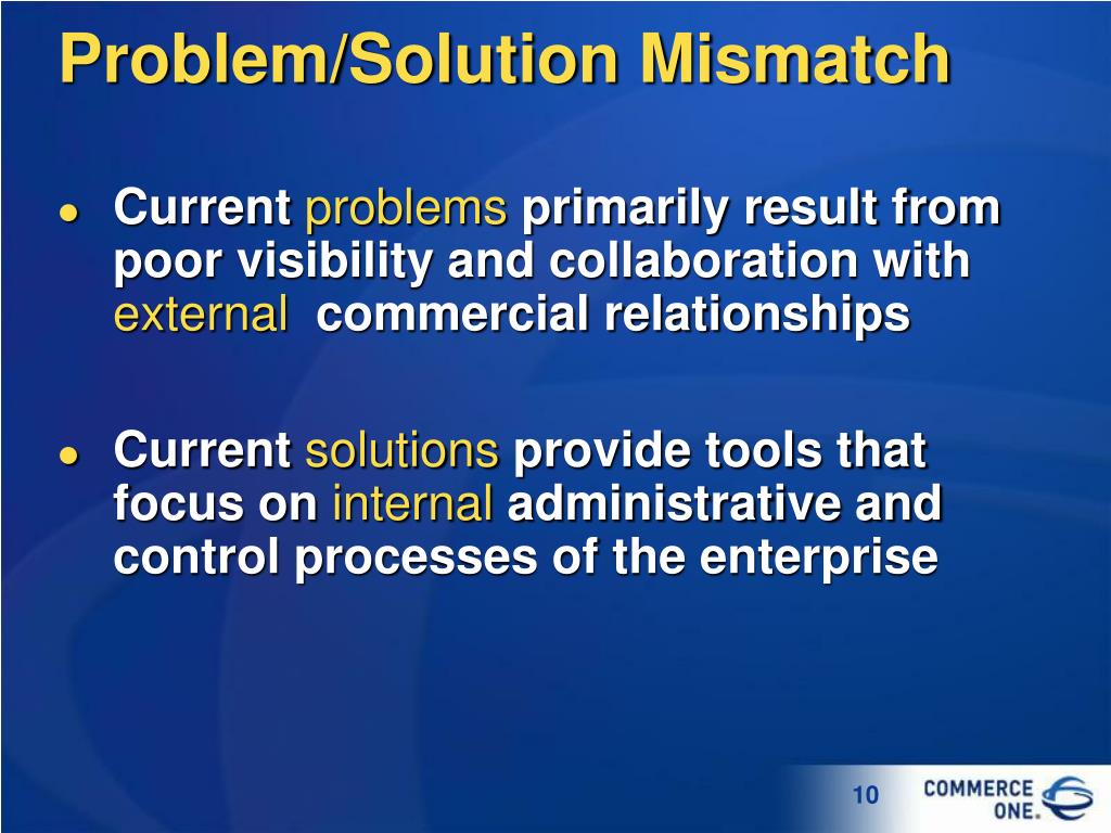 Problem/Solution Mismatch • Current problems primarily result from poor visibility and collaboration with external commercial relationships • Current solutions provide tools that focus on internal administrative and control processes of the enterprise
