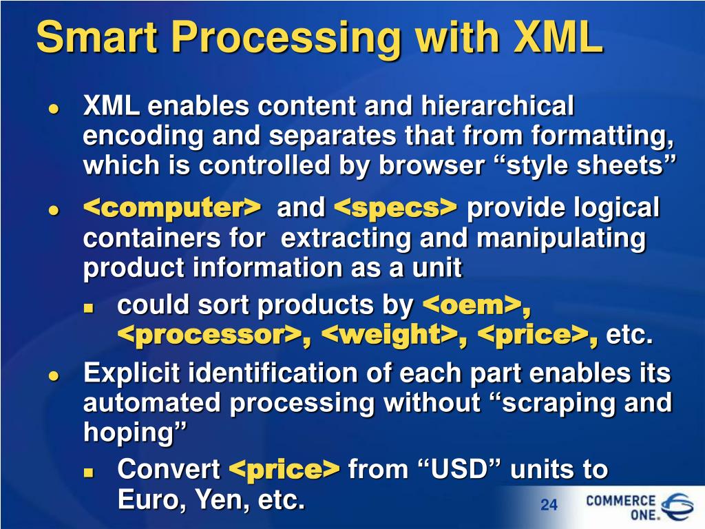 Smart Processing with XML • XML enables content and hierarchical encoding and separates that from formatting, which is controlled by browser “style sheets” • <computer>and<specs>provide logical containers for extracting and manipulating product information as a unit • could sort products by <oem>, <processor>, <weight>, <price>,etc. • Explicit identification of each part enables its automated processing without “scraping and hoping” • Convert <price> from “USD” units to Euro, Yen, etc.