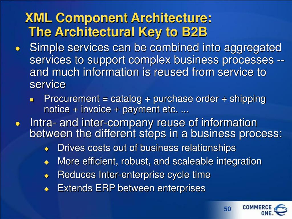 XML Component Architecture: The Architectural Key to B2B • Simple services can be combined into aggregated services to support complex business processes -- and much information is reused from service to service • Procurement = catalog + purchase order + shipping notice + invoice + payment etc. ... • Intra- and inter-company reuse of information between the different steps in a business process: • Drives costs out of business relationships • More efficient, robust, and scaleable integration • Reduces Inter-enterprise cycle time • Extends ERP between enterprises