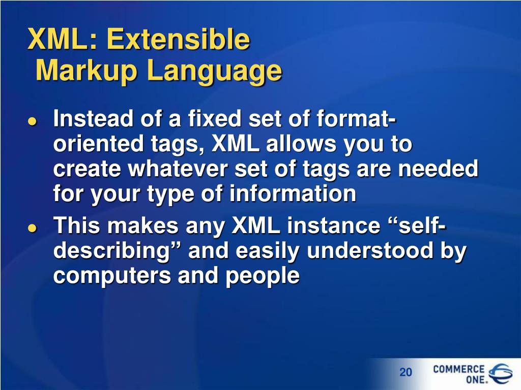 XML: Extensible Markup Language • Instead of a fixed set of format-oriented tags, XML allows you to create whatever set of tags are needed for your type of information • This makes any XML instance “self-describing” and easily understood by computers and people