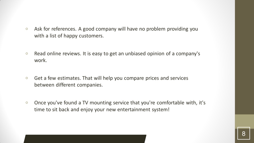 ○ Ask for references. A good company will have no problem providing you with a list of happy customers. ○ Read online reviews. It is easy to get an unbiased opinion of a company's work. ○ Get a few estimates. That will help you compare prices and services between different companies. ○ Once you've found a TV mounting service that you're comfortable with, it's time to sit back and enjoy your new entertainment system! 8