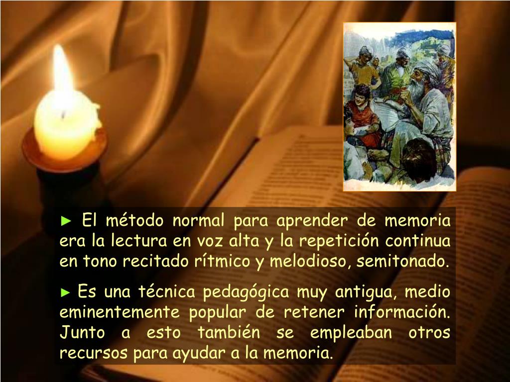 ► El método normal para aprender de memoria era la lectura en voz alta y la repetición continua en tono recitado rítmico y melodioso, semitonado. ►Es una técnica pedagógica muy antigua, medio eminentemente popular de retener información. Junto a esto también se empleaban otros recursos para ayudar a la memoria.