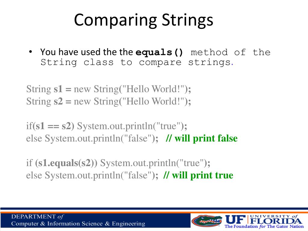 Comparing Strings You have used the the equals() method of the String class to compare strings. String s1 = newString("Hello World!"); String s2 = newString("Hello World!"); if(s1 == s2) System.out.println("true"); elseSystem.out.println("false");// will print false if (s1.equals(s2)) System.out.println("true"); elseSystem.out.println("false");// will print true