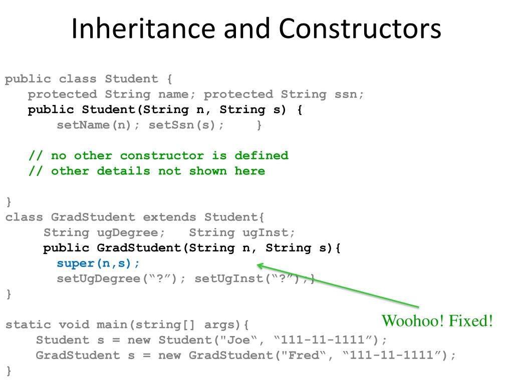Inheritance and Constructors public class Student { protected String name; protected String ssn; public Student(String n, String s) { setName(n); setSsn(s); } // no other constructor is defined // other details not shown here } class GradStudent extends Student{ String ugDegree; String ugInst; public GradStudent(String n, String s){ super(n,s); setUgDegree(“?”); setUgInst(“?”);} } static void main(string[] args){ Student s = new Student("Joe“, “111-11-1111”); GradStudent s = new GradStudent("Fred“, “111-11-1111”); } Woohoo! Fixed!
