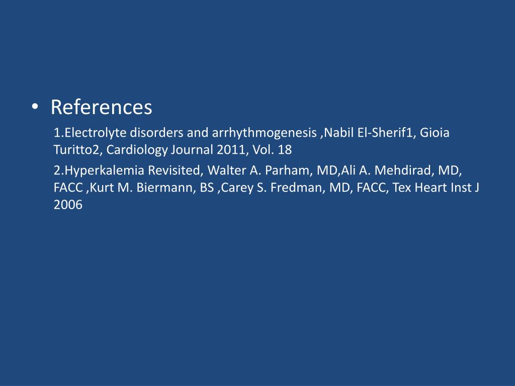 References 1.Electrolyte disorders and arrhythmogenesis ,Nabil El-Sherif1, Gioia Turitto2, Cardiology Journal 2011, Vol. 18 2.Hyperkalemia Revisited, Walter A. Parham, MD,AliA. Mehdirad, MD, FACC ,Kurt M. Biermann, BS ,Carey S. Fredman, MD, FACC, Tex Heart Inst J 2006