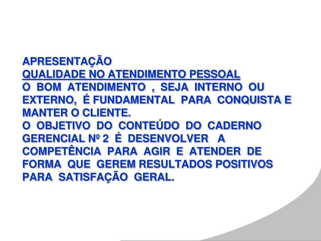 APRESENTAÇÃO QUALIDADE NO ATENDIMENTO PESSOALO BOM ATENDIMENTO , SEJA INTERNO OU EXTERNO, É FUNDAMENTAL PARA CONQUISTA E MANTER O CLIENTE.O OBJETIVO DO CONTEÚDO DO CADERNO GERENCIAL Nº 2 É DESENVOLVER A COMPETÊNCIA PARA AGIR E ATENDER DE FORMA QUE GEREM RESULTADOS POSITIVOS PARA SATISFAÇÃO GERAL.