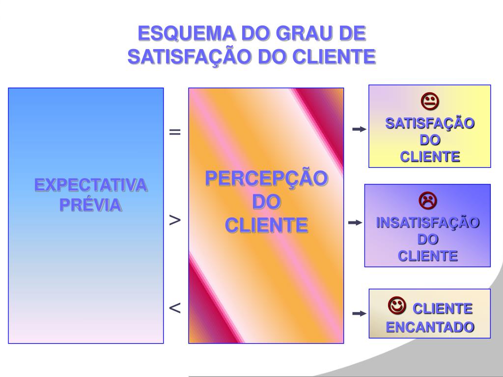 ESQUEMA DO GRAU DE SATISFAÇÃO DO CLIENTE SATISFAÇÃO DO CLIENTE = PERCEPÇÃO DO CLIENTE EXPECTATIVA PRÉVIA INSATISFAÇÃO DO CLIENTE > < CLIENTE ENCANTADO