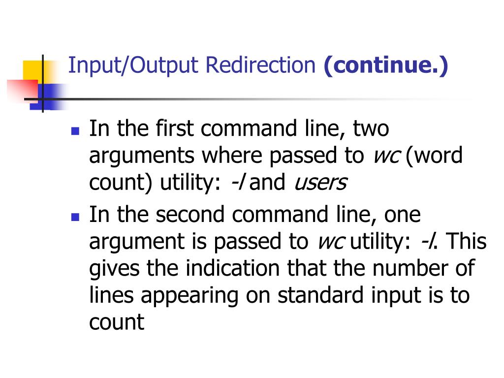 Input/Output Redirection (continue.) • In the first command line, two arguments where passed to wc (word count) utility: -l and users • In the second command line, one argument is passed to wc utility: -l. This gives the indication that the number of lines appearing on standard input is to count