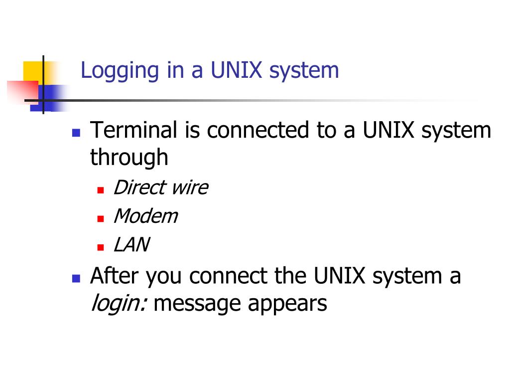 Logging in a UNIX system • Terminal is connected to a UNIX system through • Direct wire • Modem • LAN • After you connect the UNIX system a login: message appears