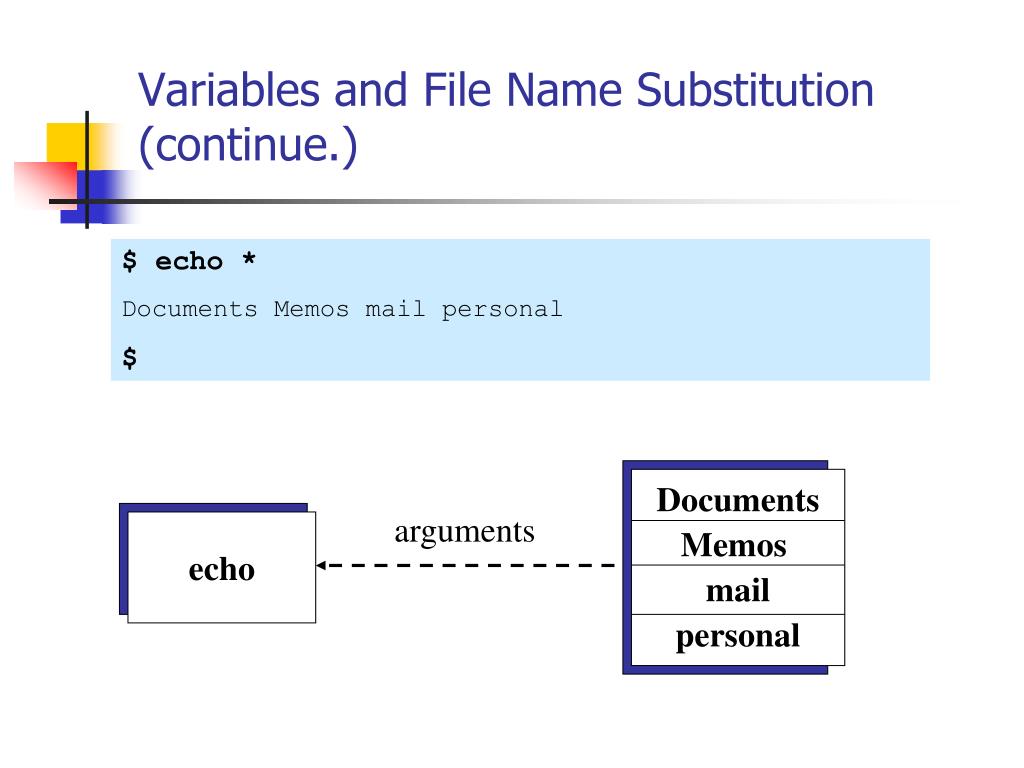 Variables and File Name Substitution (continue.) $ echo * Documents Memos mail personal $ Documents Memos mail personal arguments echo