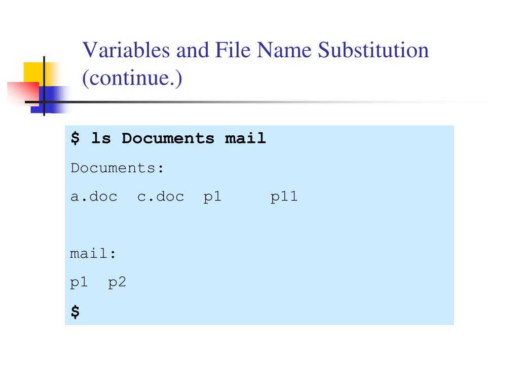 Variables and File Name Substitution (continue.) $ ls Documents mail Documents: a.doc c.doc p1 p11 mail: p1 p2 $