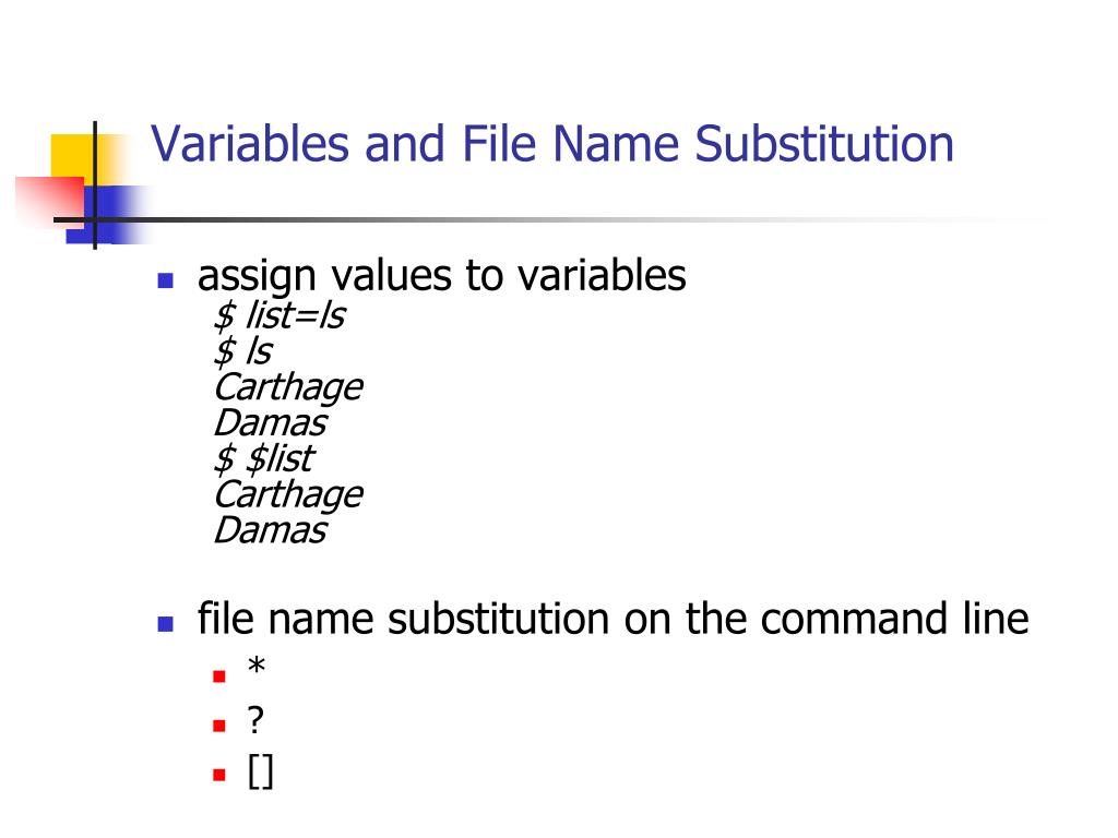 Variables and File Name Substitution • assign values to variables $ list=ls $ ls Carthage Damas $ $list Carthage Damas • file name substitution on the command line • * • ? • []