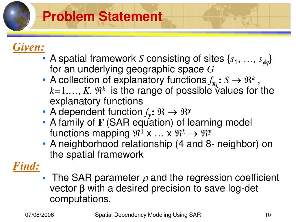 Problem Statement Given: • A spatial framework S consisting of sites {s1, …, sq} for an underlying geographic space G • A collection of explanatory functions fxk: S k , k=1,…, K. k is the range of possible values for the explanatory functions • A dependent function fy: y • A family of F (SAR equation) of learning model functions mapping 1 x … x k y • A neighborhood relationship (4 and 8- neighbor) on the spatial framework Find: • The SAR parameter and the regression coefficient vector with a desired precision to save log-det computations. Spatial Dependency Modeling Using SAR