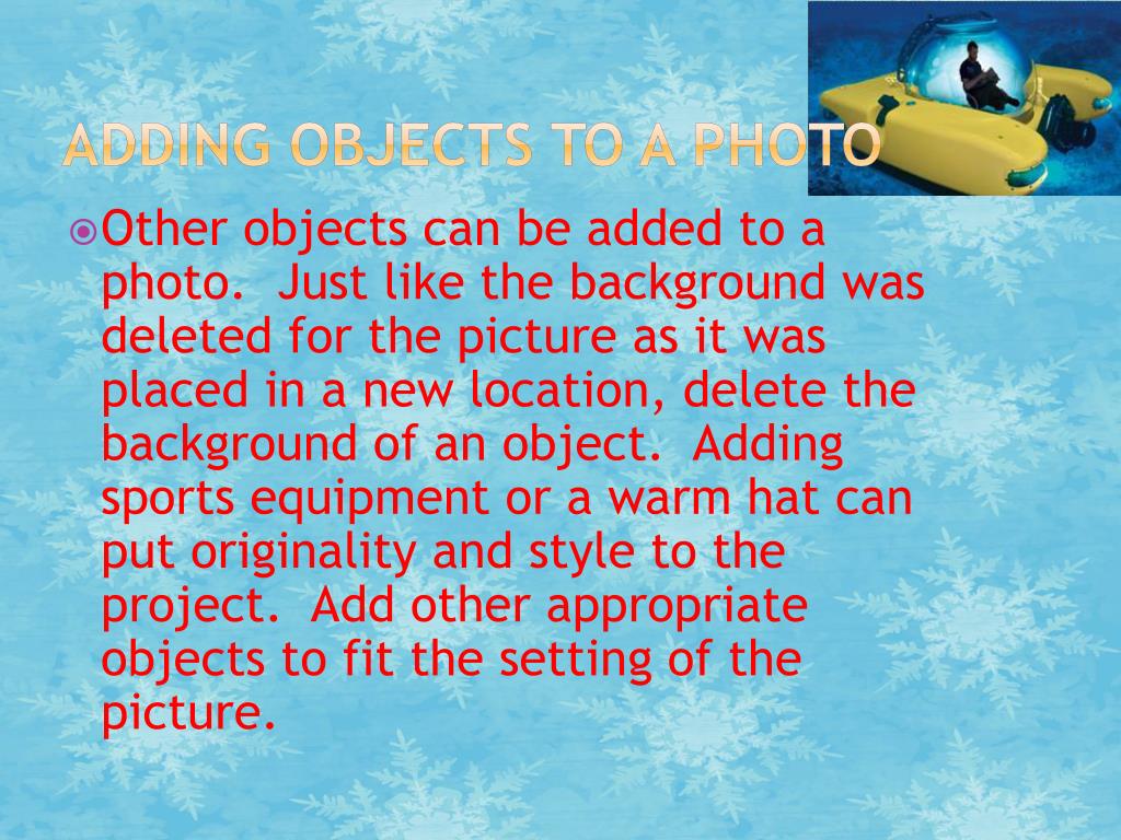 Adding objects to a photo • Other objects can be added to a photo. Just like the background was deleted for the picture as it was placed in a new location, delete the background of an object. Adding sports equipment or a warm hat can put originality and style to the project. Add other appropriate objects to fit the setting of the picture.