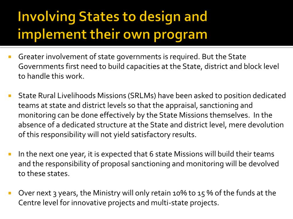Involving States to design and implement their own program • Greater involvement of state governments is required. But the State Governments first need to build capacities at the State, district and block level to handle this work. • State Rural Livelihoods Missions (SRLMs) have been asked to position dedicated teams at state and district levels so that the appraisal, sanctioning and monitoring can be done effectively by the State Missions themselves. In the absence of a dedicated structure at the State and district level, mere devolution of this responsibility will not yield satisfactory results. • In the next one year, it is expected that 6state Missions will build their teams and the responsibility of proposal sanctioning and monitoring will be devolved to these states. • Over next 3 years, the Ministry will only retain 10% to 15 % of the funds at the Centre level for innovative projects and multi-state projects.