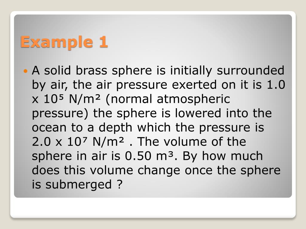 A solid brass sphere is initially surrounded by air, the air pressure exerted on it is 1.0 x 10⁵ N/m² (normal atmospheric pressure) the sphere is lowered into the ocean to a depth which the pressure is 2.0 x 10⁷ N/m² . The volume of the sphere in air is 0.50 m³. By how much does this volume change once the sphere is submerged ? Example 1