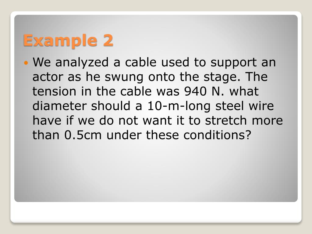We analyzed a cable used to support an actor as he swung onto the stage. The tension in the cable was 940 N. what diameter should a 10-m-long steel wire have if we do not want it to stretch more than 0.5cm under these conditions? Example 2