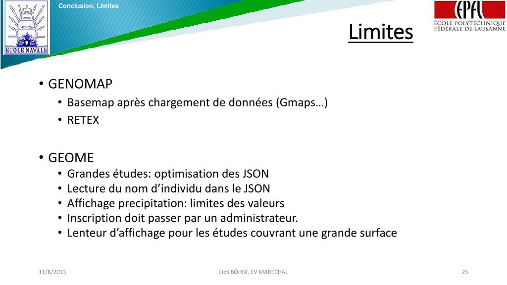 Conclusion, Limites Limites • GENOMAP • Basemap après chargement de données(Gmaps…) • RETEX • GEOME • Grandesétudes: optimisation des JSON • Lecture du nom d’individudans le JSON • Affichageprecipitation: limites des valeurs • Inscription doit passer par un administrateur. • Lenteur d’affichage pour les études couvrant une grande surface LtzS BÖHM, EV MARÉCHAL