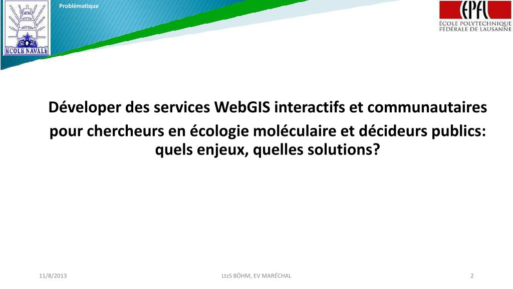 Problématique Déveloper des services WebGISinteractifs et communautaires pour chercheurs en écologiemoléculaire et décideurs publics: quelsenjeux, quelles solutions? LtzS BÖHM, EV MARÉCHAL
