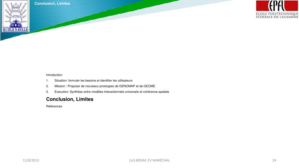 Conclusion, Limites Introduction • Situation: formulerles besoins et identifier les utilisateurs • Mission : Proposer de nouveaux prototypes de GENOMAP et de GEOME • Execution: Synthèse entre modèlesinteractionnelsuniversels et cohérencespatiale Conclusion, Limites Références LtzS BÖHM, EV MARÉCHAL